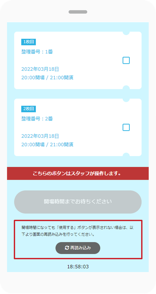 • ※開場時間になっても「使用する」ボタンが表示されない場合は「再読み込み」ボタンを